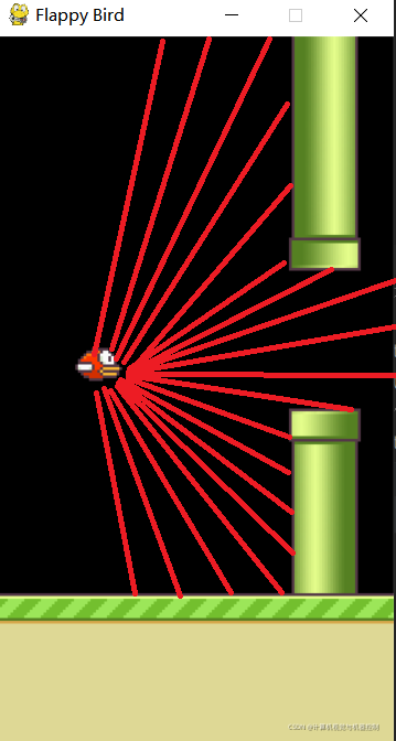 ? ? ? ? 辐射线相当于激光雷达,测量控制对象与障碍物的距离。以后我将为深度强化学习案例Flappy Bird 添加检测线。如下: