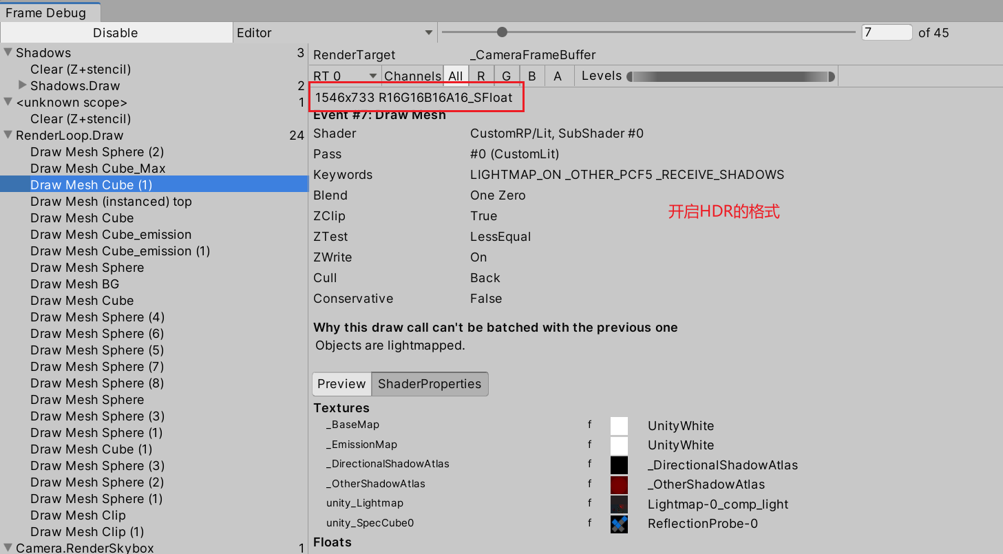 (1)HDR的格式: 在unity中是 RGBA 每个通道16位 非HDR: 每个通道8位   (2)逐步执行DrawCall时,你会注意到场景看起来比最终结果要暗。发生这种情况是因为这些步骤存储在HDR纹理中。由于线性颜色数据按原样显示,因此看起来很暗,它错误地解释为sRGB。  (3)Luminance函数: 客观测量发光体的亮度,是个客观值 函数: luminance = 0.2125 * Red + 0.7154 * Green + 0.0721 * Blue;