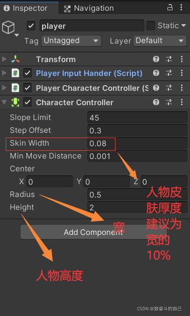 1,一个输入脚本,一个玩家移动脚本(有人就发现这样不就没角色了吗?角色到后面可以自己将建模加入成为plyerRoot的子对象)