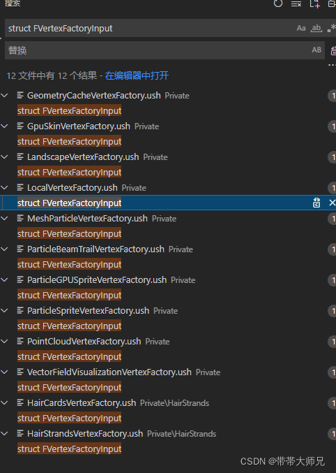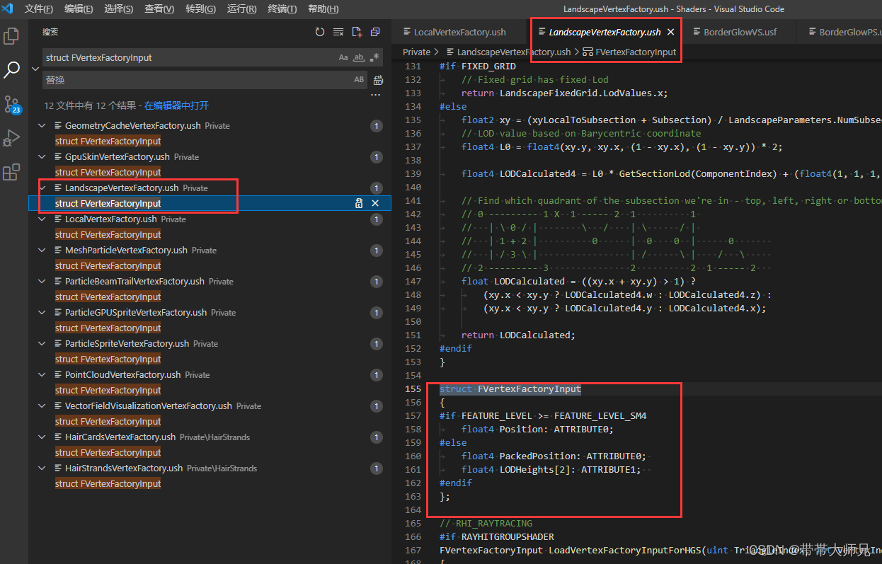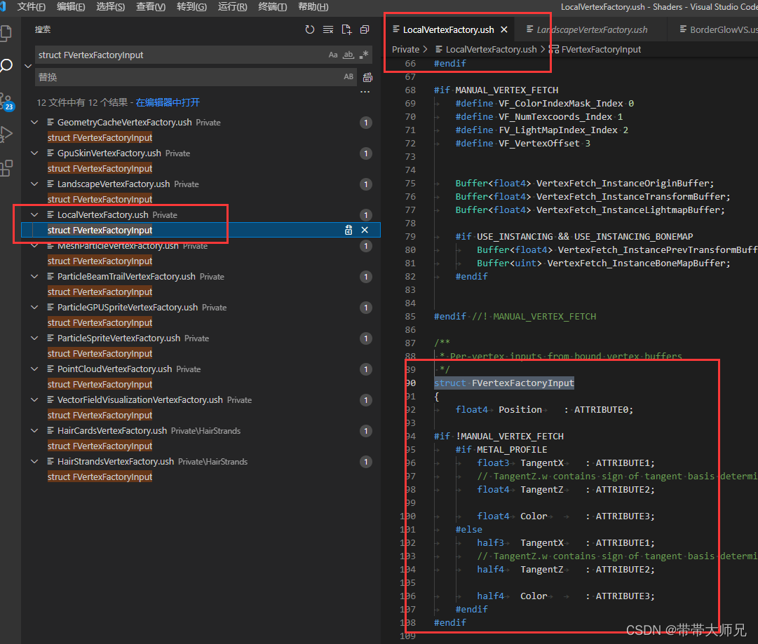 ?FVertexFactoryInput代表顶点的格式,同一个?FVertexFactoryInput绝对不可能兼容所有类型的Mesh格式,UE4做个奇妙的涉及,自动编译Shader, 根据Mesh的顶点工厂类型都来把相应的顶点工厂代码套入到相应MeshShader的模板代码,也就是#include "/Engine/Generated/VertexFactory.ush",当然除了顶点格式配套,还有某些同名的转换函数实现也得配套