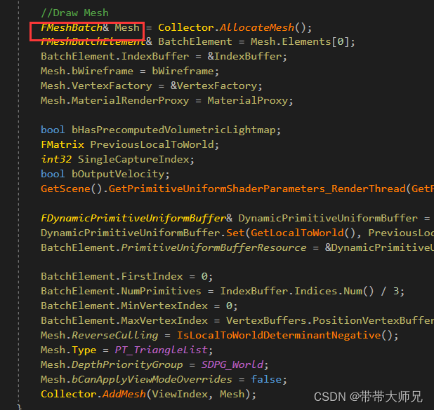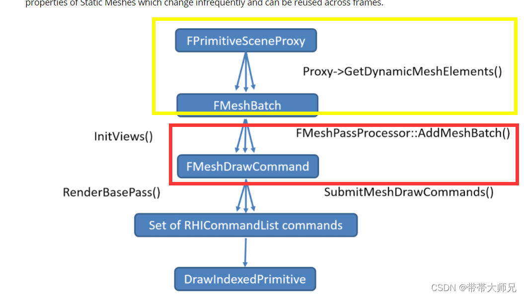 MeshPass在游戏线程的中间对象是FPrimitiveSceneProxy,在FPrimitiveSceneProxy的GetDynamicMeshElements函数(渲染线程)中 MeshPass会被转为FMeshBatch也就是上图的黄色部分的场景渲染代理,具体可以参考(UE4 4.27)自定义PrimitiveComponent_带帯大师兄的博客-CSDN博客