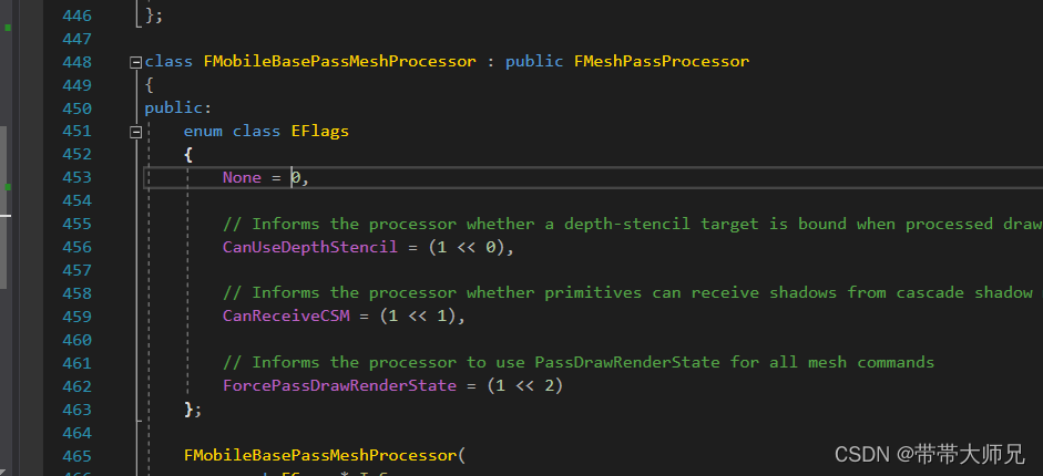 这里的FMeshPassProcessor我理解为一个渲染阶段,比如RenderGbuffer,RenderShadow,RenderSSR都是渲染阶段,如果你想添加一个渲染Mesh的阶段,你就得定义新的FMeshPassProcessor, 比如FMobileBasePassMeshProcessor实现了Mobile端对物体的基础渲染。