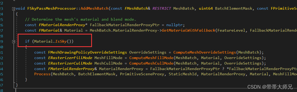 ?如果你只想对某类Mesh进行处理转为渲染指令,一般是通过材质, DepthStencilState(是否渲染深度模板)等信息来筛选的,比如FSkyPassMeshProcessor就是只对天空材质的Mesh才进行渲染.边缘发光的筛选也是参考开头文章自定义了新的ShadingModel: BorderGlow