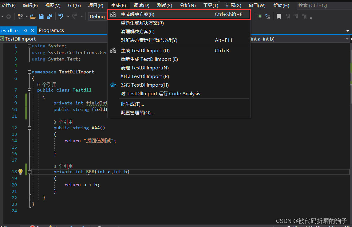 1.首先我们在C#中创建一个Testdll类 打包dll,内容如下