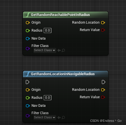 GetRandomPointInNavigableRadius:不一定可达。例如在孤立平台上,随机到周围地面,实际上从当前位置到随机位置不可达。