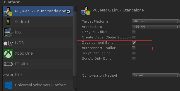 - 构建项目的时候打开DevelopmentBuild和autoconnect