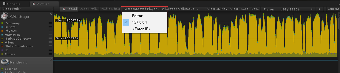 - 打开unity 的profiler,在connectplayer中选择要连接的远程实例,如下