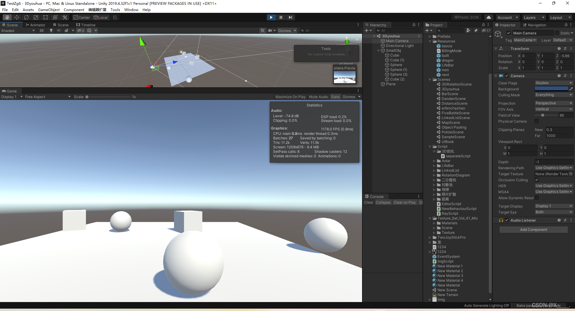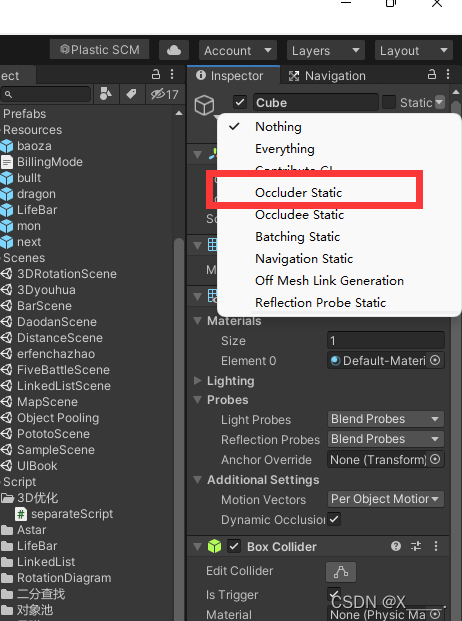 2.给除了主角、摄像机、直线光和地面的其他物体对象标记为“遮挡静态(Occluder Static/Occludee Static)”