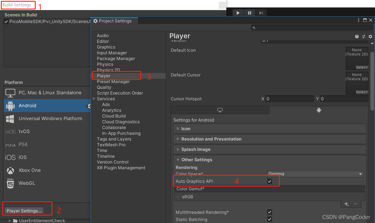 8 进阶功能 — PicoVR Unity SDK 0.1 文档 http://sdk.picovr.com/docs/UnitySDK/cn/chapter_eight.html#id10? ? ?在Unity的菜单栏里找到Pvr_UnitySDK打开,选择Platform Settings,在细节栏里禁用“User Entitlement Check”。?