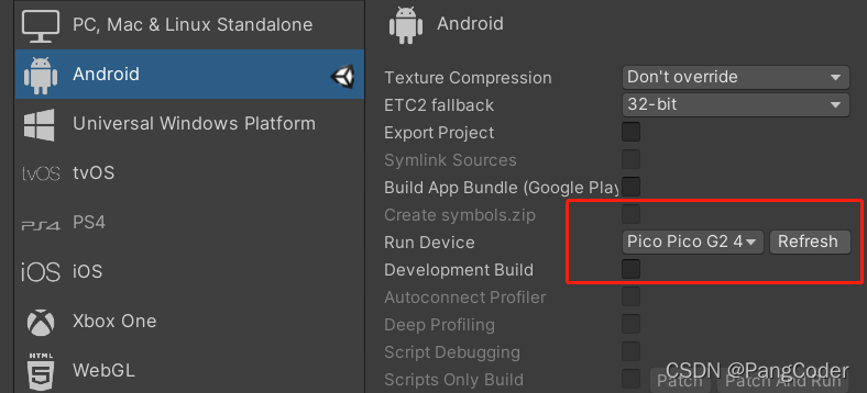 1 How to access Developer Options — PicoVR FAQ 0.1 documentation https://sdk.picovr.com/docs/FAQ/chapter_one.html? ? ? ? 戴上头盔,打开“设置”---》“通用”,对着“软件版本号”连点五下(用头盔旁边按钮选择),“开发者”图标出现后,进入开发者,选择系统,再选择开发者选项,最后打开USB调试,这样在Unity中就能找到硬件了。