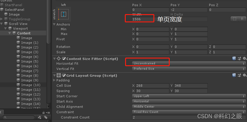 若content锚点为Left,有ContentSizeFitter组件,需将Honizontal Fit改为unconstrained,设置每页宽度,使用脚本中方法二计算方式。