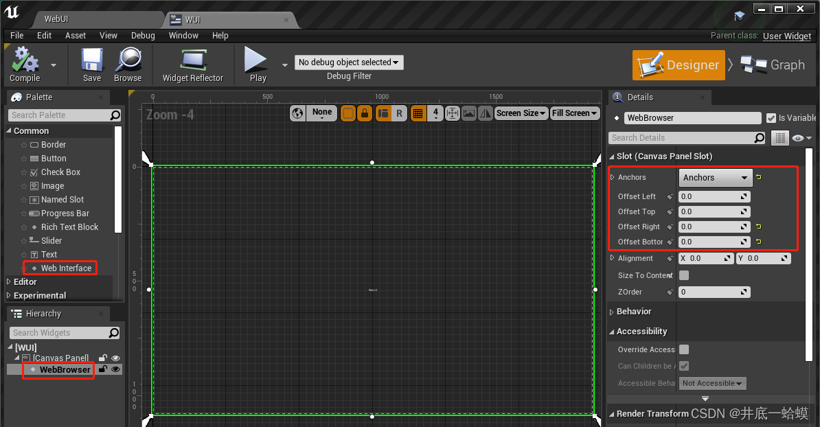 创建UMG取名WUI,并添加WebInterface控件,Anchors全屏