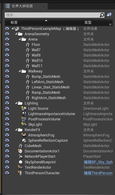 世界大纲视图显示关卡中所有项的层级关系,提供选择、搜索、删除、设置父代、分组和显示/隐藏项的工具。它位于虚幻编辑器右上角,本质上是一个层级结构。