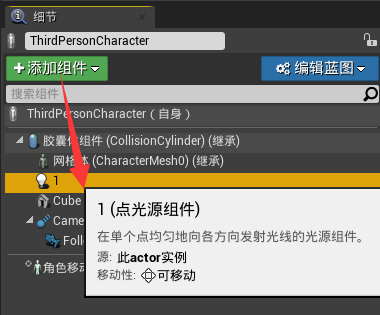 “细节(Details)”面板显示在关卡中选中的项、组件及其属性。在这个面板,可以进行:更改属性值,添加组件,将选中的项转换成蓝图 等操作。