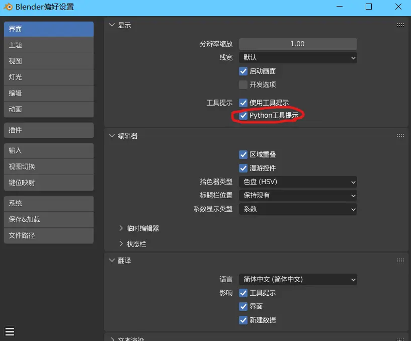 Blender的编程模块就内嵌在软件当中,当然你也可以使用Vscode进行编程。不过这里使用Blender内置的文本编辑器。在编程开始之前,首先要确保开启Python工具提示。