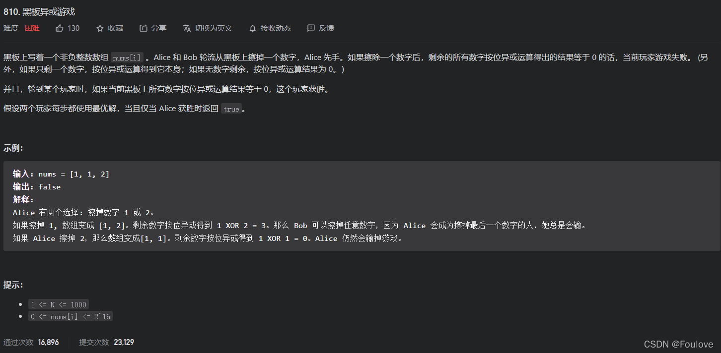 这其实是个博弈论的问题,谁先手谁后手,数组为偶数个还是奇数个都是决定胜负的关键,但我们的目标还是那句话,只需要达到将算法过程变成更好理解的方式,也就是说假设你是Alice并且先手,然后当你擦掉数字之后,另一个人选的时候,异或运算得出的结果是0,看到0的这个人就欣喜的胜利了,也就是winner,抓住这点,我们就可以开始做了。