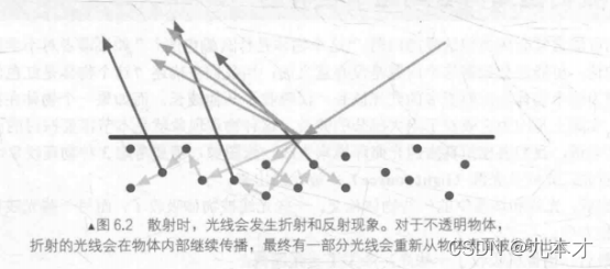 散射只改变光线的方向。光线在物体表面经过散射后,有两种放方向:一种将散射到物体内部,这种现象称之为折射或透射;另一种将会散射到外部,这种现象称之为反射。对于不透明的物体,折射进入物体内部的光线还会继续与内部的颗粒进行相交,其中一些光线最后会从新发射出物体表面,二另一些则被物体吸收。这些物体表面重新发射出的光线将具有和入射光线不同的方向分布和颜色。?