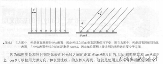 在实时渲染中,我们通常把光源当成一个没有体积的点,用L 来表示她的方向。那么,我们如何测量一个光源发射出多少光呢?也就是说,我们如何量化光,在光学里,我们使用辐照度来量化光。对于平行光来说,他的辐照度可通过计算在垂直于L的单位面积上单位时间穿过的能量来得到。在计算光照模型时,我们需要知道一个物体表面的辐照度,而物体表面往往是和L不垂直的,那么如何计算这样的表面辐照度呢?我么你可以使用光源的方向L和表面法线n之间的夹角的余弦值来得到。需要注意的是,这里默认方向矢量的模都为1。?