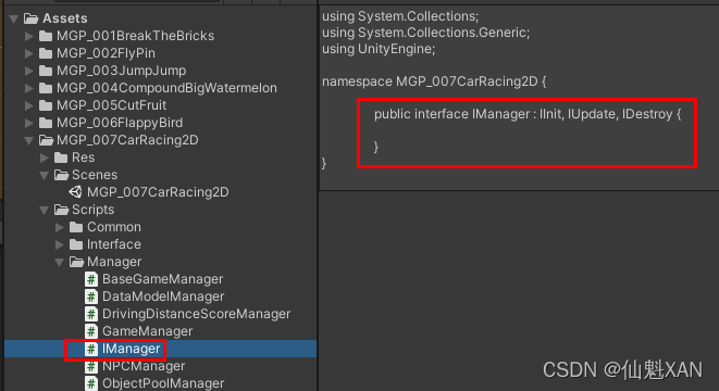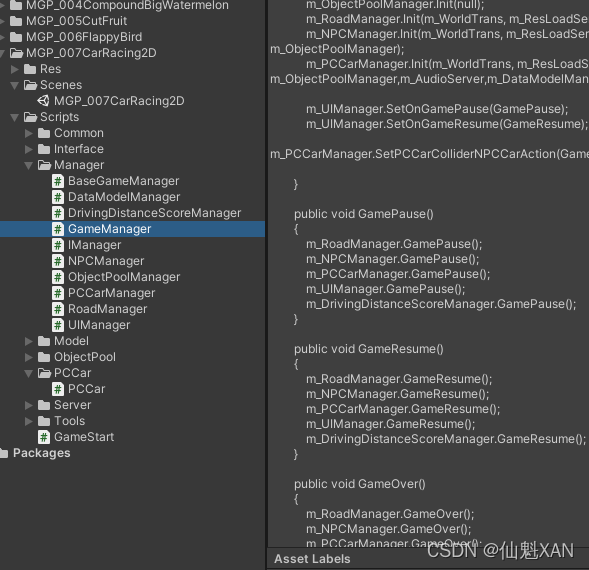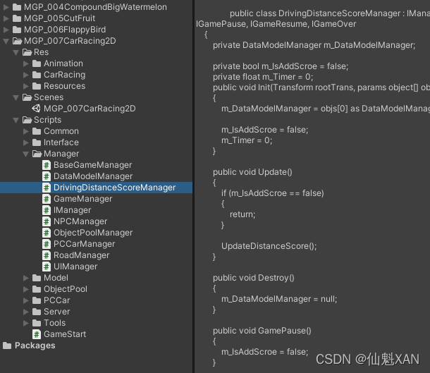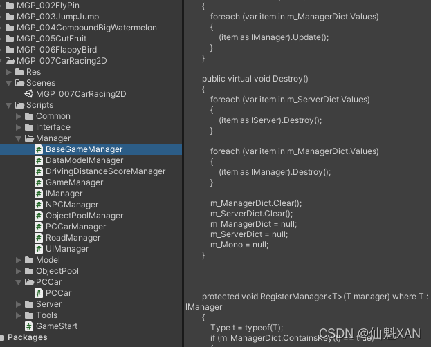 35、在工程中添加 GameManager 脚本(单例),继承BaseGameManager ,主要功能:1)获取场景中相关游戏物体或者 UI根物体,2)new 相关的 Manager 管理类,初始化Init,Update 、和Destroy,3)判断游戏状态,是否暂停、继续、结束