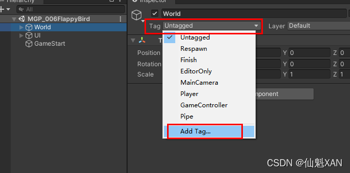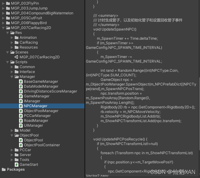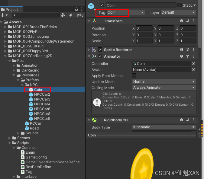 17、Tag tag 定义类,其中 Tag 定义方式如下,选择一个游戏物体,选择 Tag 下拉菜单,点击 Add Tag ... 添加 Tag ,然后选择 + ,命名一个名称,save 即可,这里,我们把预制体的 NPCCarx 的? Tag 设置为 NPCCar(后面碰撞体触发用到),Coin 设置为 Coin