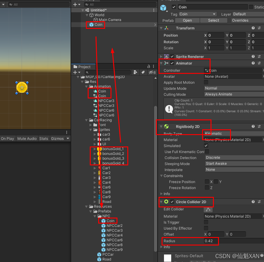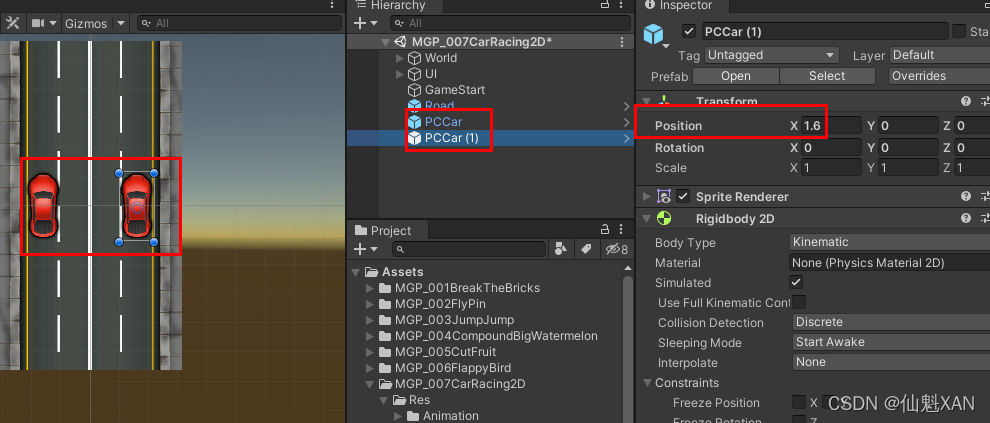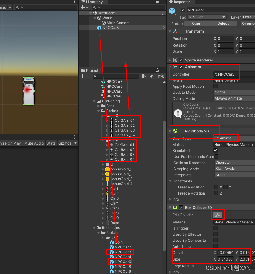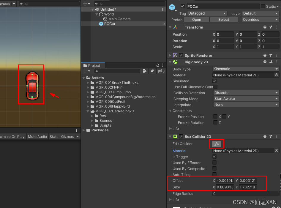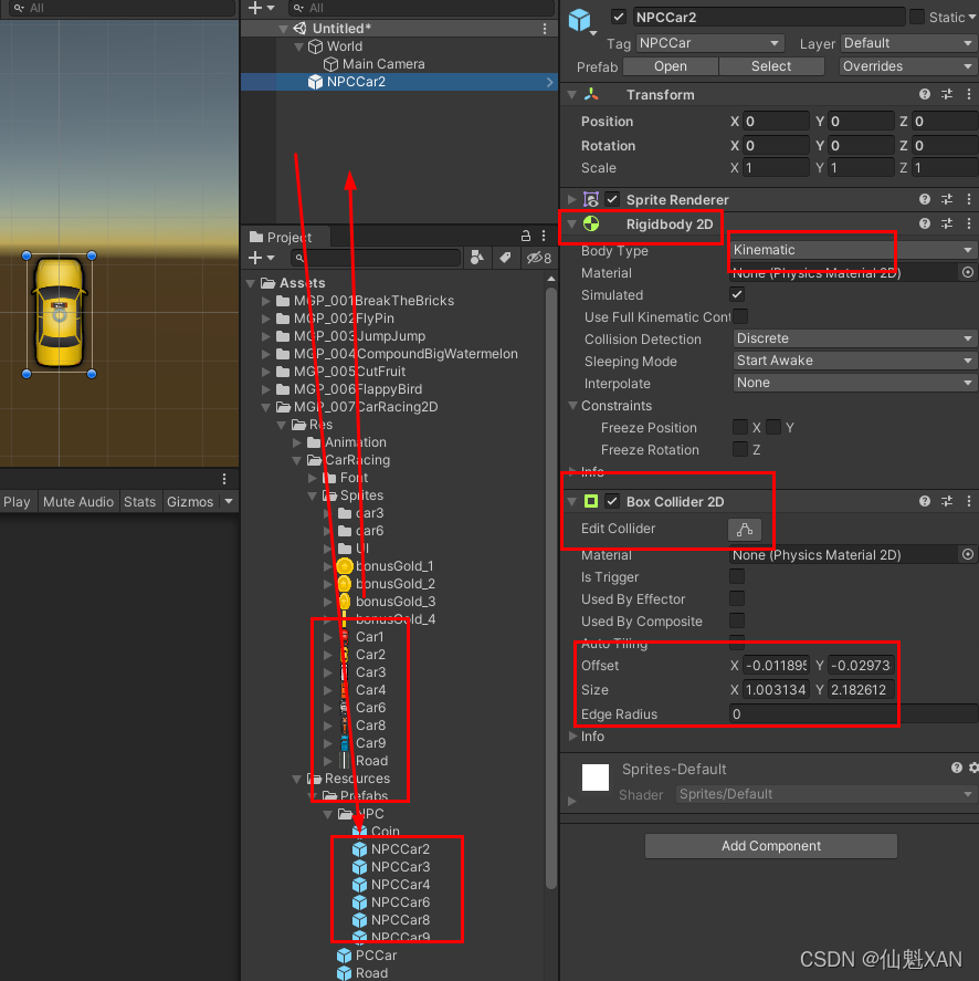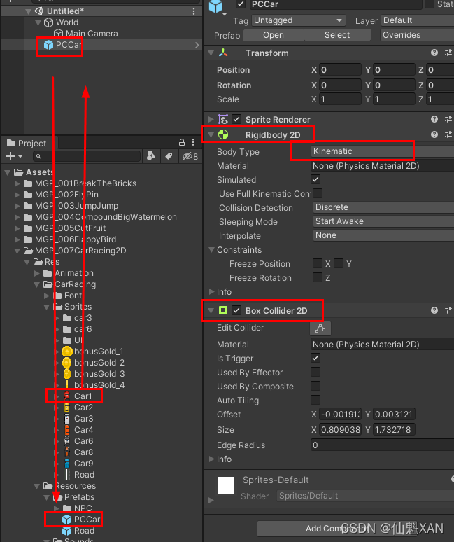 5、拖 Car1到场景中,改名为 PCCar,添加 Rigidbody2D,BodyType 设置为 Kinematic (不需要重力效果,但是有运动学效果),并拖入到 Resources 作为预制体,并添加 BoxCollider2D,调整其大小适配车子大小