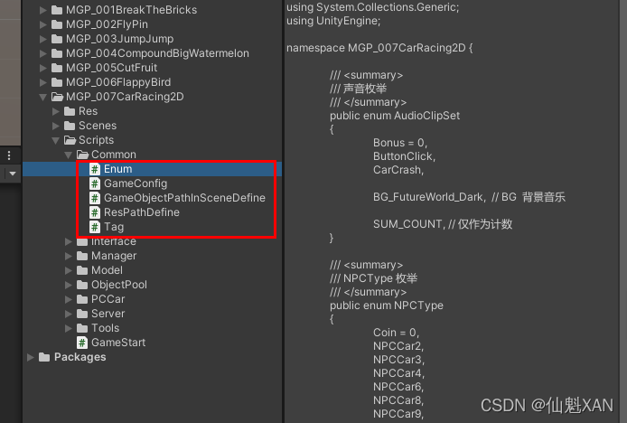 16、在工程中添加 Common (一般可以游戏开发最后写,脚本中抽出来,整理统一管理),管理游戏中的一些常量,Enum 管理所有枚举,GameConfig 一些游戏配置,GameObjectPathInSceneDefine 场景中的游戏物体路径定义,ResPathDefine 预制体路径定义类,Tag tag 定义类