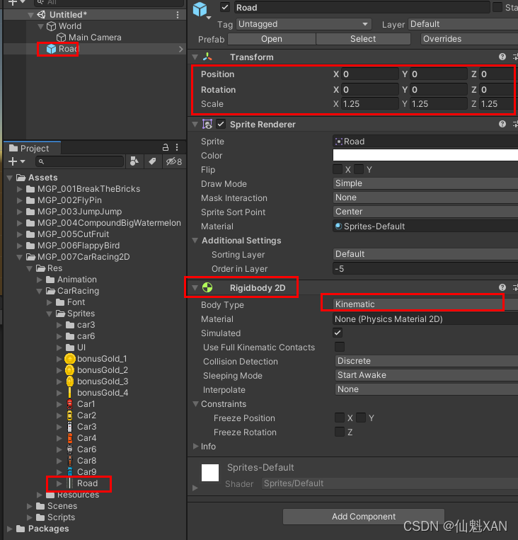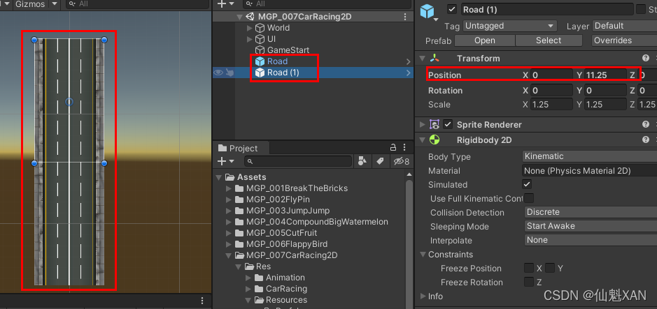 4、把 Road 拖到场景中,根据现有Game 视口,适配 Scale(这里适配得到(1.25,1.25,1.25)),添加 Rigidbody2D,BodyType 设置为 Kinematic (不需要重力效果,但是有运动学效果),并拖入到 Resources 作为预制体