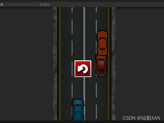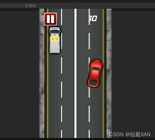 1、游戏开始,背景 Road 自动向下移动,玩家 Car 随机位置 ,等待点击 Play 开始游戏