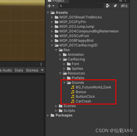 ?9、把 Sounds 也拖到 Resources 文件夹下,使用 Resources 动态加载音频文件