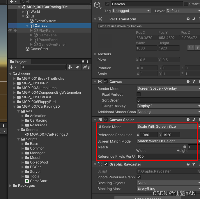 11、在UI下面,添加一个Canvas (自动添加EventSystem),设置 Canvas Scaler 的 UI Scale Mode 为 Scale with Screen Size ,Reference Resolution 为? 1080 x 1920? ,Match 滑动到 Height