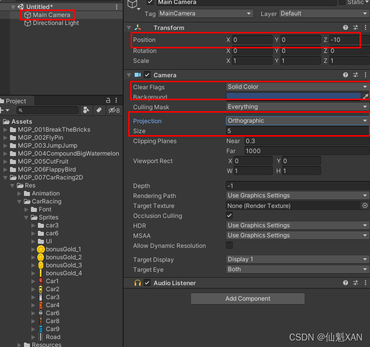 2、把 Main Camera 的位置设置为(0,0,-10),Clear Flags 设置为 Solid Color , Projection 设置为 Orthofraphic ,如图