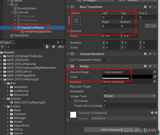 15、 添加 GameOverPanel,各个参数设置,和效果图如下