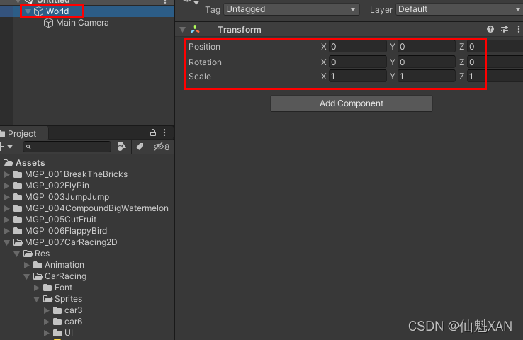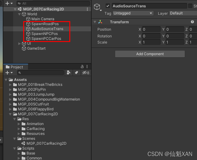 10、在 World 下面添加多个 GameObject,位置都为(0,0,0),改名为 SpawnRoadPos,AudioSourceTrans,SpawnNPCPos,SpawnPCCarPos,功能如其名,用于生成Road父物体,音频源挂载,生成NPCPos的父物体,生成 PCCar 的父物体