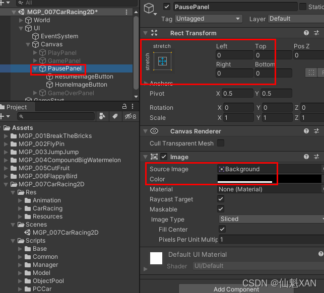 14、添加 PausePanel,各个参数设置,和效果图如下