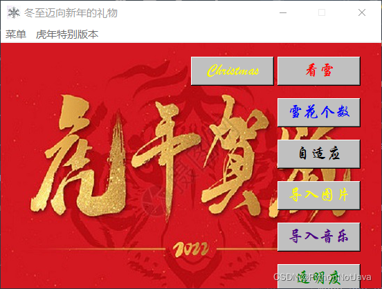 # 我们将定义如下功能:开始、调整雪花个数、窗口自适应图片大小比例、导入别的图片、修改图片透明度、修改背景音乐、修复注册机