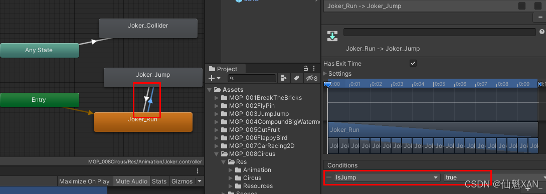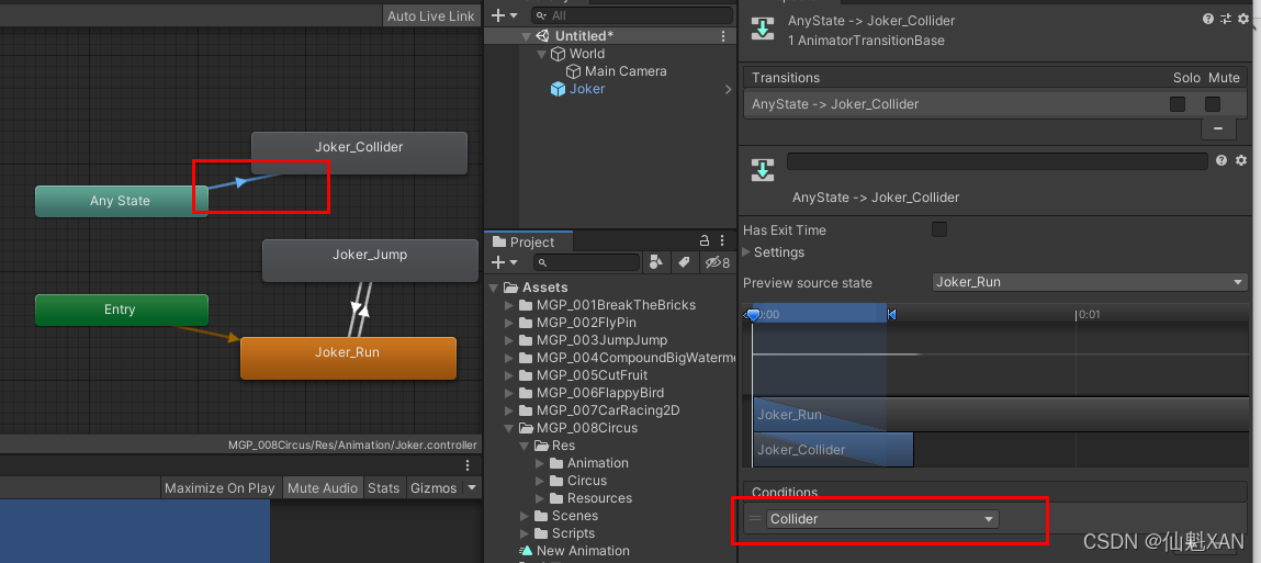 7、选中 Joker,然后 Window-Aniamtion-Animator,动画过渡线如图,添加 Collider(Trigger) 和 IsJump(Bool) 参数,Any State 过渡线到 Joker_Collider 是 Collider ,Joker_Run 过渡线到 Joker_Jump 是 IsJump 为 true ,Joker_Jump? 过渡线到 Joker_Run? 是 IsJump 为 false,最后拖到 Resources 文件夹下作为预制体