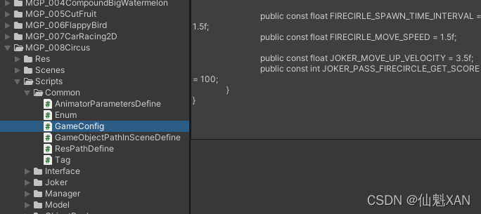 15、在工程中添加 Common (一般可以游戏开发最后写,脚本中抽出来,整理统一管理),管理游戏中的一些常量,AnimatorParametersDefine动画机参数定义类,Enum 管理所有枚举,GameConfig 一些游戏配置,GameObjectPathInSceneDefine 场景中的游戏物体路径定义,ResPathDefine 预制体路径定义类,Tag tag 定义类
