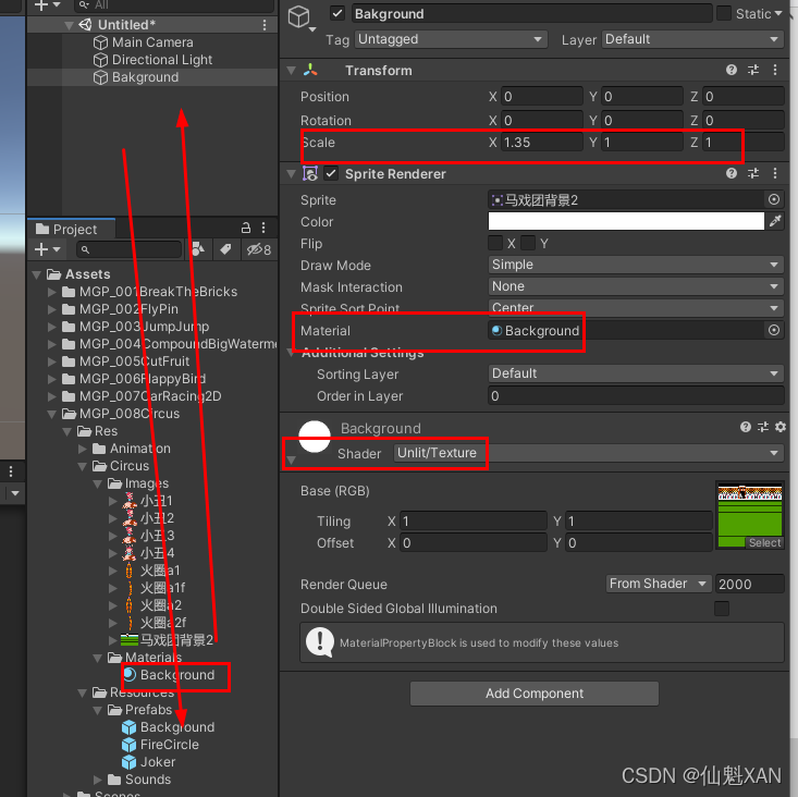 3、把背景图改名为 Background ,调整 Scale? X 比例为 1.35(根据需要调整合适值) 使之铺满 Game 窗口,创建 Material ,shader 设置为 Unlit-Texture ,赋给 Background ,并把 Background? 拖到 Resources ,设置为 预制体