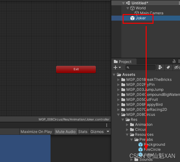 2、Joker 有重力效果,挂载Rigidbody2D, 通过 GetComponent<Rigidbody2D>().Velocity 的 方向添加速度,来实现向上跳动的效果