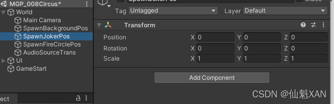 10、在 World 下面添加多个 GameObject,位置都为(0,0,0),改名为 SpawnBackgroundPos,AudioSourceTrans,SpawnJokerPos,SpawnFireCirclePos,功能如其名,用于生成 Background 父物体,音频源挂载,生成 Joker 的父物体,生成 FireCircle 的父物体