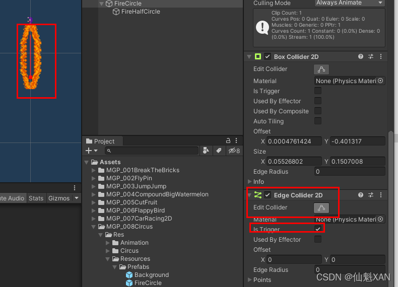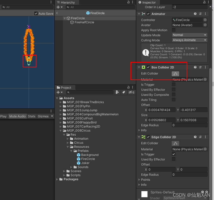 8-1、给 FireCircle 添加 BoxCollider2D ,size 和位置设置如下,作为碰撞火圈结束的碰撞体,添加 EdgeCollider2D,设置大小方向如下,勾选 IsTrigger 作为触发得分使用