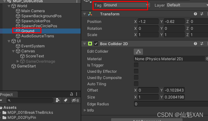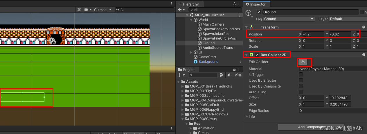11、在 World 下面添加 GameObject,改名为 Ground ,添加 BoxCollider2D,位置为(-1.2,-0.62,0),x 作为后面 Joker 生成的位置(根据需调整BoxCollider2D ,位置)