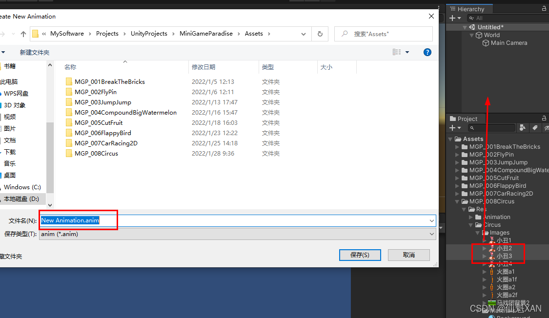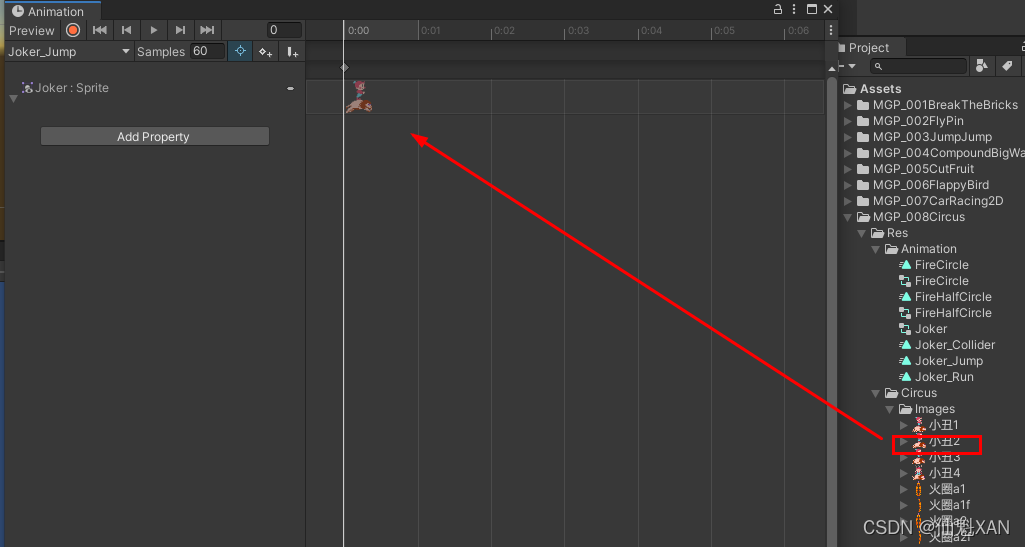 5、把小丑2-3图片拖到场景中,创建小丑的 Joker_Run 动画,和 Joker 动画机,改名为 Joker ,选中 Joker,然后 Window-Aniamtion-Animation ,在 Animation 窗口添加 Joker_Jump(小丑2图) 和 Joker_Collider(小丑4图) 动画