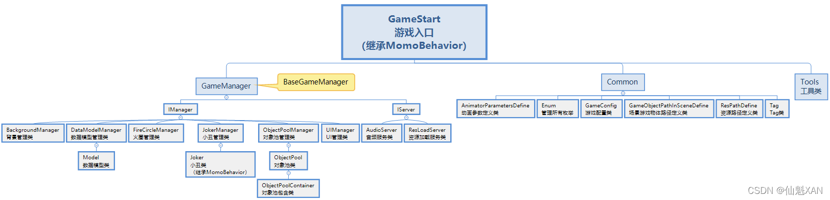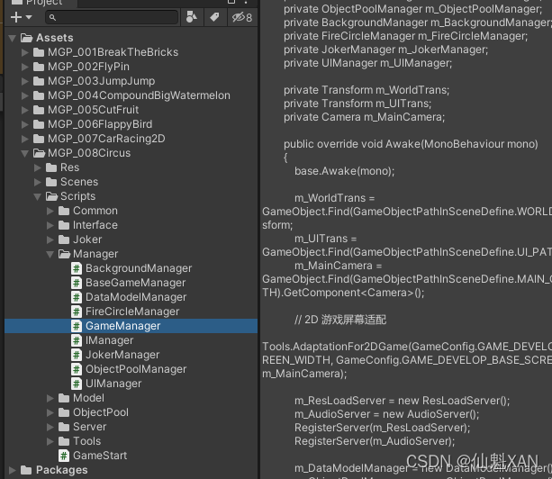 32、在工程中添加 GameManager 脚本(单例),继承BaseGameManager ,主要功能:1)获取场景中相关游戏物体或者 UI根物体,简单游戏适配;2)new 相关的 Manager 管理类,初始化Init;3)背景音乐开启与关闭的功能;4)判断游戏状态,是否游戏结束
