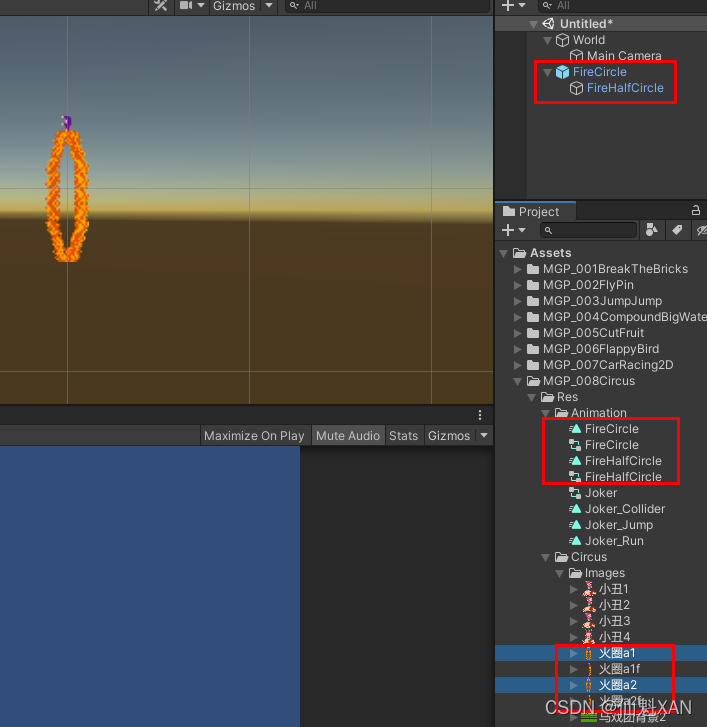 4、火圈是两层 Sprite 组成,Sprite 中的 layer 不同,且一个大于 Joker 的 layer ,一个小于 Joker 的 Layer ,从而实现跳跃火圈的效果