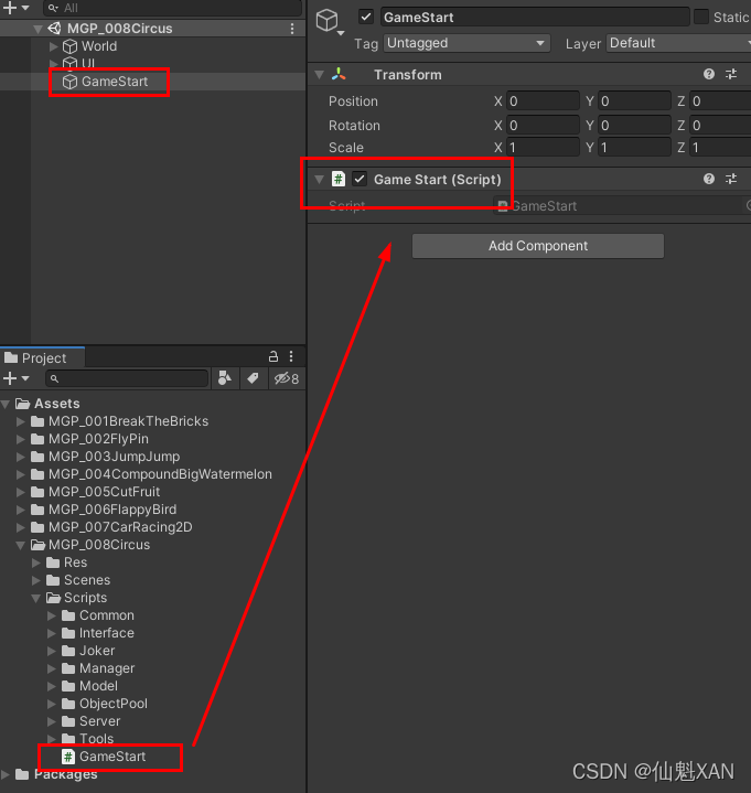34、在场景中添加 GameObject 空物体,改名为 GameStart,并且挂载 GameStart 脚本