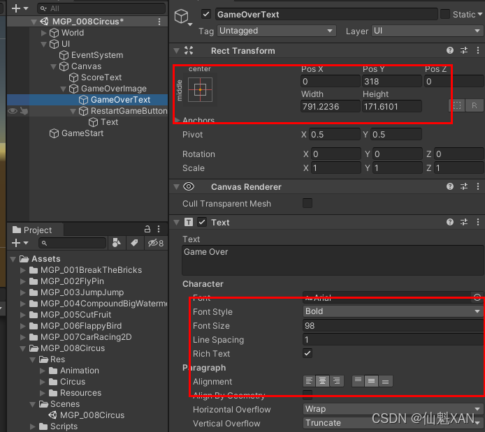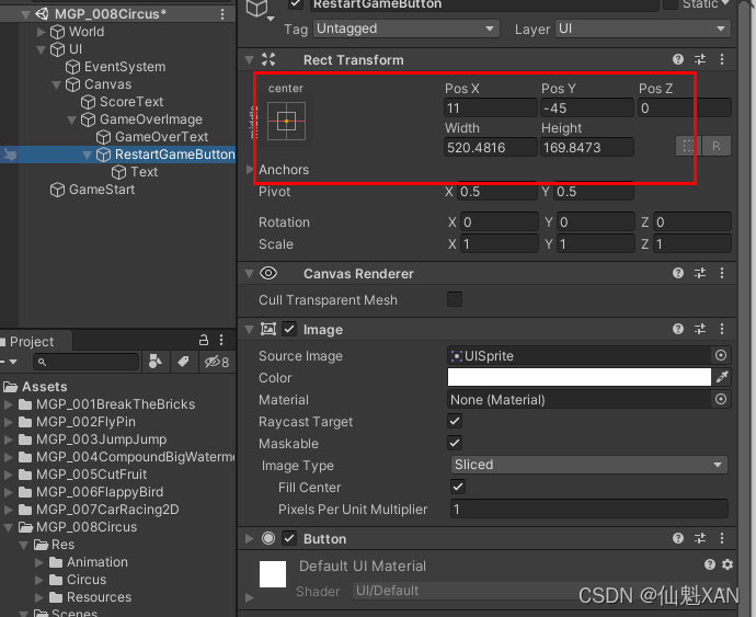14、在Canvas 下,添加 GameOverImage ,参数设置如图