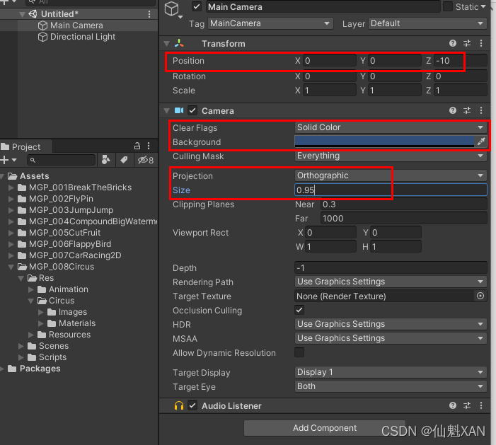 2、把 Main Camera 的位置设置为(0,0,-10),Clear Flags 设置为 Solid Color , Projection 设置为 Orthofraphic,调整 Size 为0.95,是在Screen (1920x1080)屏幕下 ,根据背景图 调整的,如图