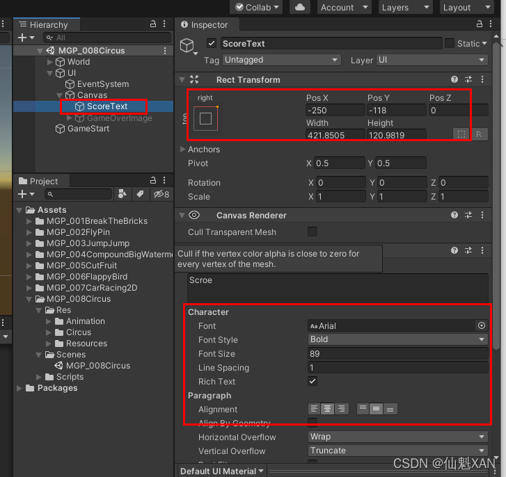 13、在Canvas 下,添加 ScoreText ,参数设置如图