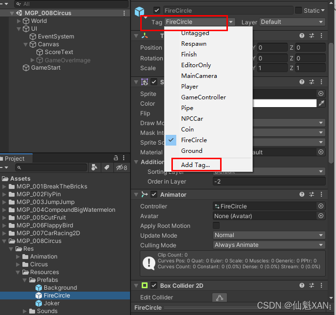16、Tag tag 定义类,其中 Tag 定义方式如下,选择一个游戏物体,选择 Tag 下拉菜单,点击 Add Tag ... 添加 Tag ,然后选择 + ,命名一个名称,save 即可,这里,我们把预制体的 FireCircle 的? Tag 设置为 FireCircle (后面碰撞体触发用到),World-Ground 设置为 Ground